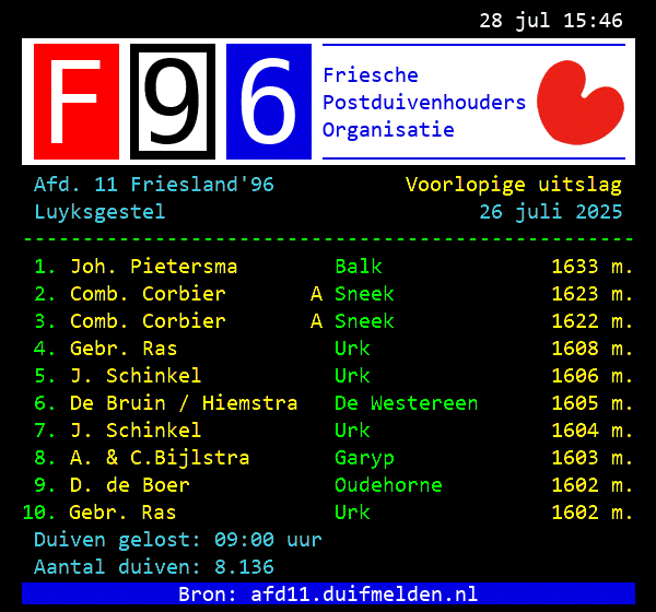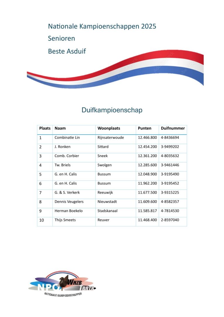 • 1st Middle Distance Ace Pigeon – NPO Dpt. 11 Friesland ’96