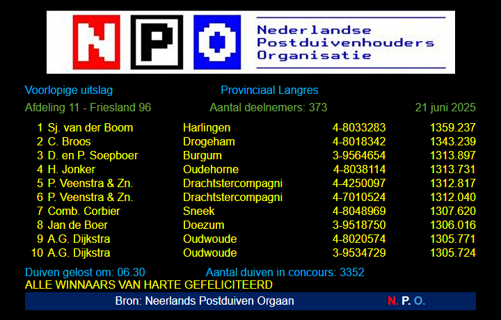 • 1st Middle Distance Ace Pigeon – NPO Dpt. 11 Friesland ’96
