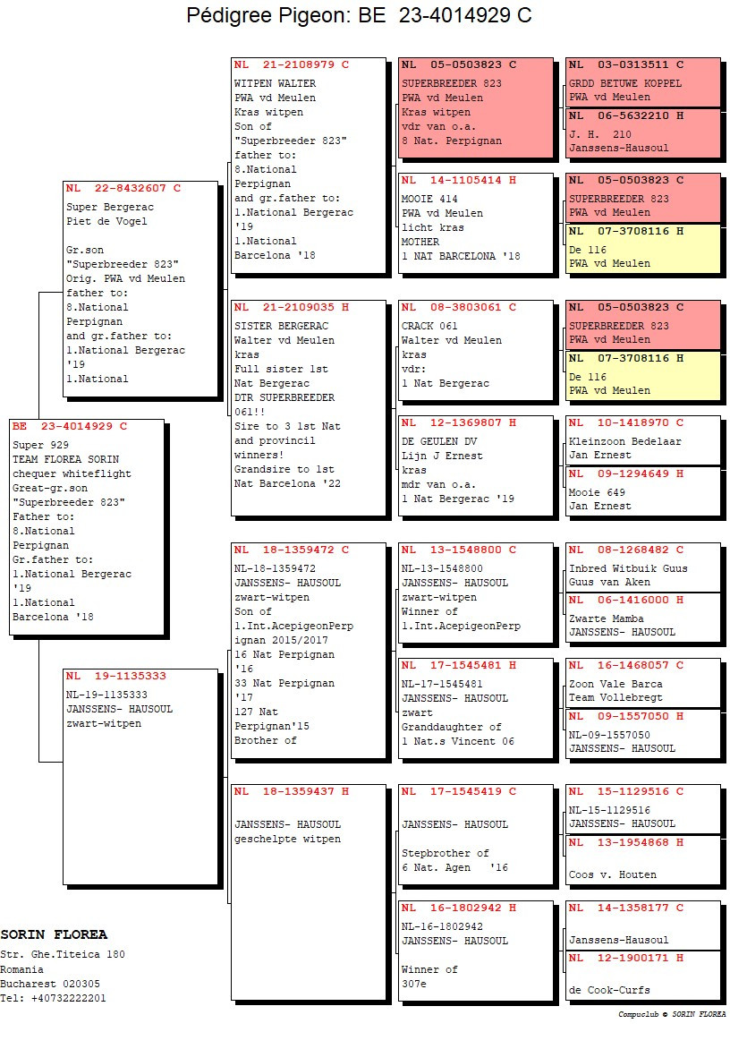 Grandson superbreeder “DE 823” PWA van der Meulen (“WITPEN WALTER” x sister “BERGERAC” 1st National Bergerac, daughter “CRACK 061”) x granddaughter of “DE 900” (Janssens- Hausoul) 1st International Ace Perpignan 3 yr !!