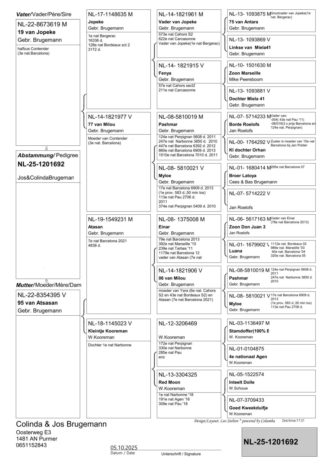 Vader is een halfbroer van Contender (3e nat Barcelona) en komt uit Jopeke (1e nationaal Bergerac) x 77 van Milou (moeder Contender). De moeder komt uit Atasan (7e nationaal Barcelona) x kleintje Kooreman wat een dochter is van de 1e nationaal Narbonne.
