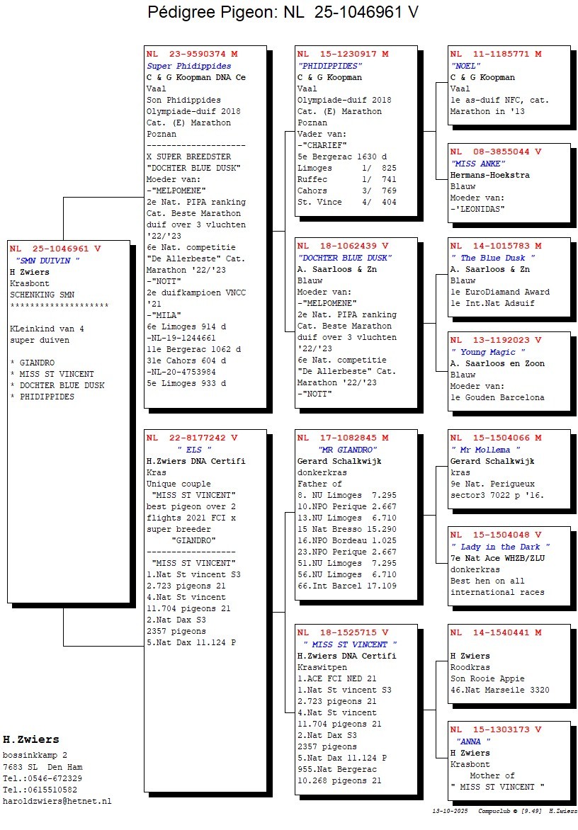 Het late jonge duivinnetje komt uit een doffer van Gerard Koopman uit de superkoppeling Phidippides x Dochter Blue Dusk. De moeder Els komt uit Mr Giandro x Miss St Vincent.