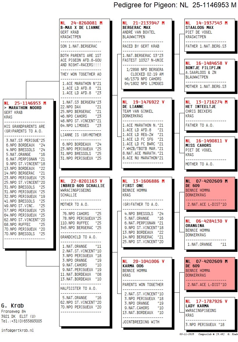 In 2023 werd zijn nationale winnaar ‘Bergerac Max’ – tevens 1e Duifkampioen van Afdeling 8 GOU 2023 – naar het kweekhok gepromoveerd en sinds 2025 bevolken ook meerdere rechtstreekse kinderen uit ‘Bergerac Max’ het kweekhok en werd er versterking gehaald bij Heikamp & Van Doorn. Uit samenkweek met Heikamp & Van Doorn met ‘Bergerac Max’ wonnen zij dit jaar reeds met een kleinkind de 3e Nationaal Perigueux Sector 3.