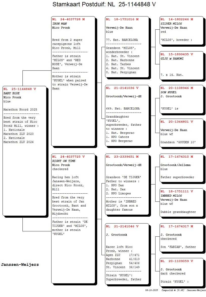 De geschonken duif komt uit twee duiven van Nico Pronk met veel Verweij-de Haan en Jan Grootoonk bloed. Dat ziet er goed uit!