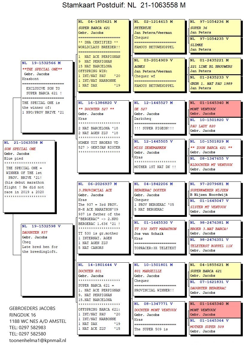In 2021 Toon Jacobs put THE SPECIAL ONE on the racing loft and started traning him on a few short distance flights. He was always in the top 10 of the pigens on the loft and Toon decided to play him on a few one day long distance races. Once he was the 3rd pigeon on the loft and once he was the 1st ! On his last flight of the year, his first marathon flight, he is the winner of the 1st NPO Brive in the Fondclub Noord-Holland. He really is a SPECIAL ONE !