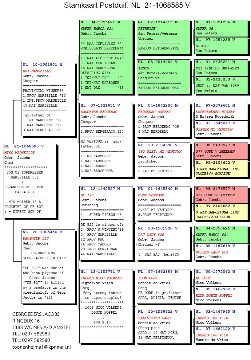 MISS MARSEILLE – daughter of the MARSEILLE 801 paired to a daughter of DE 527 (stolen from the loft in october 2021 together with the SUPER BARCA 621 and others). DE 527 is a direct son of the MONT VENTOUX and a full brother to the fathers of 2nd National Barcelona and 2nd National Agen ZLU