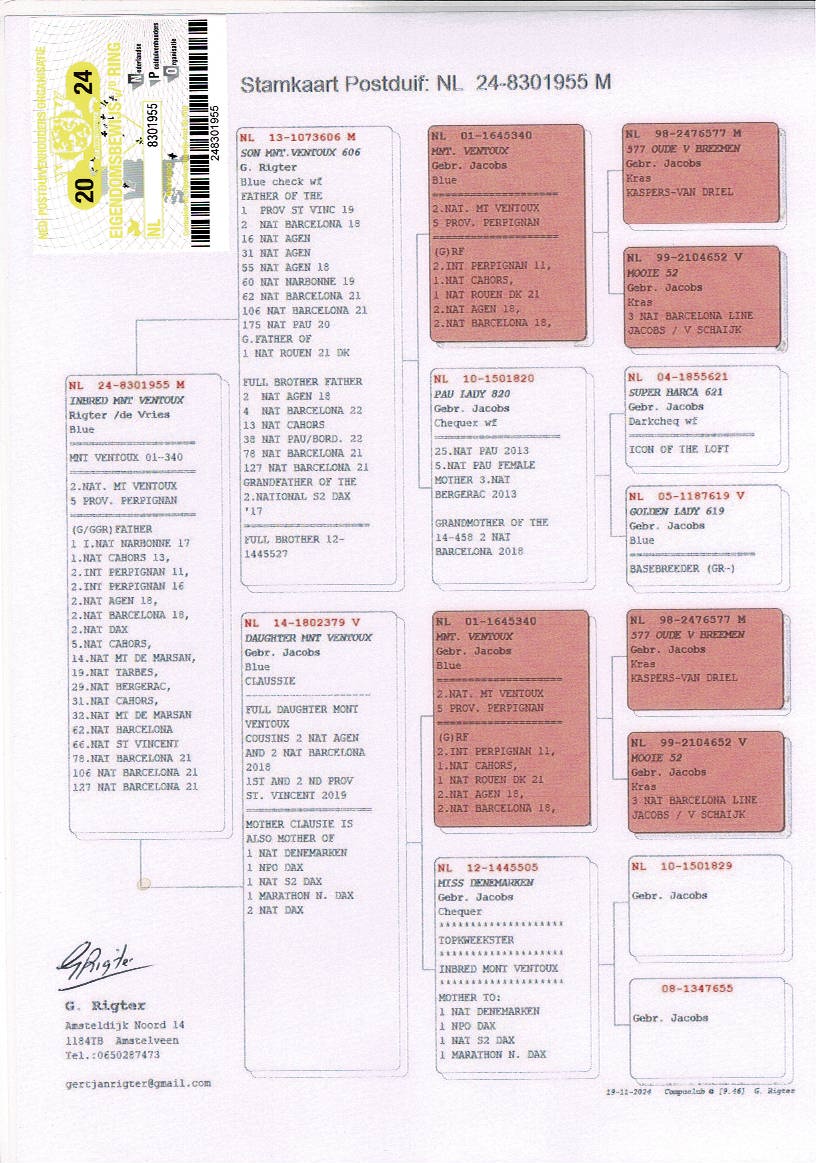 Greatgrandfather of the Best International Perpignan pigeon 2023-2024, winner of 10 International Perpignan ’23, 22 International Perpignan ’24 “LUNA”