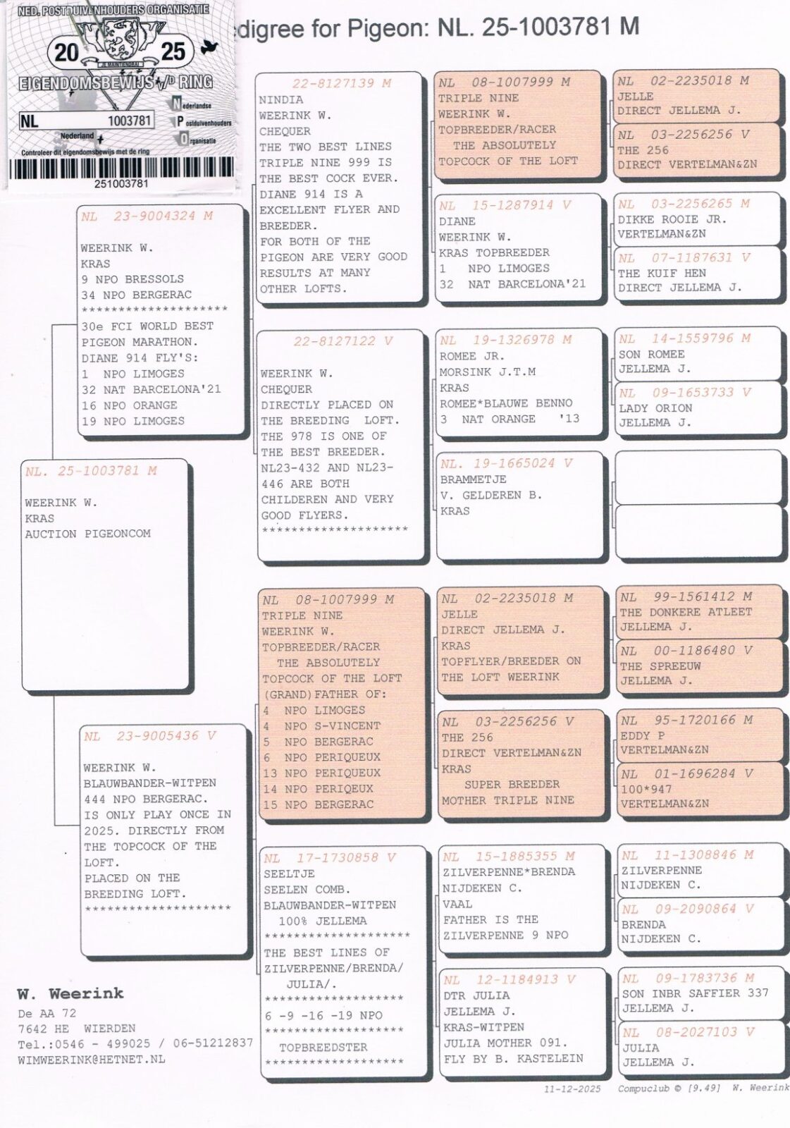Son of the 30st World’s Best Marathon Pigeon FCI ’25 (grandson of “TRIPPLE NINE“) x daughter super breeder “TRIPPLE NINE” !!