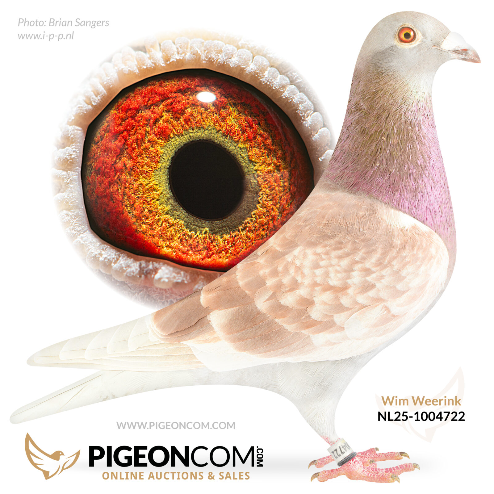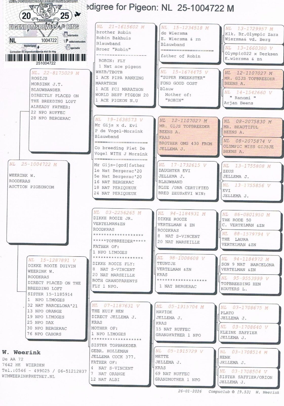 Son of “DIKKE ROOIE DUIVIN” (sister “DIANE” 1st NPO Limoges, 32 National Barcelona, etc) base lines of Wim Weerink: Vertelman x Jellema x “ROGIJS” brother “ROBIN” 1st World’s Best Marathon pigeon FCI x daughter topbreeder “MR. GIJS” !!