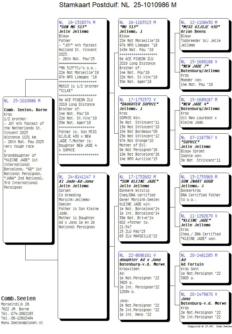 Son of “SON MG513” father of “JOY” 4th National St Vincent ’24, 26th National Pau ’25 x granddaughter of “KLEINE JADE” 1st International Barcelona, “AD” 1st National Perpignan, “JADA” 2nd National & 3rd International Perpignan !!