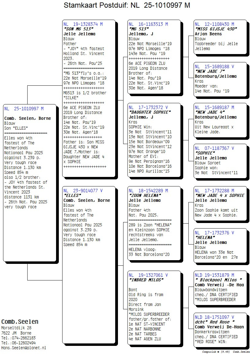 Son of “ELLES” the new super pigeon of the loft and winner of the 4th National Pau ’25 (very tough flight, distance 1.130 km, speed 854 mpm – metres per minute) against 3.239 pigeons ’25 paired to “SON MG513” father of “JOY” 4 National St Vincent ’24, 26 National Pau ’25 !!