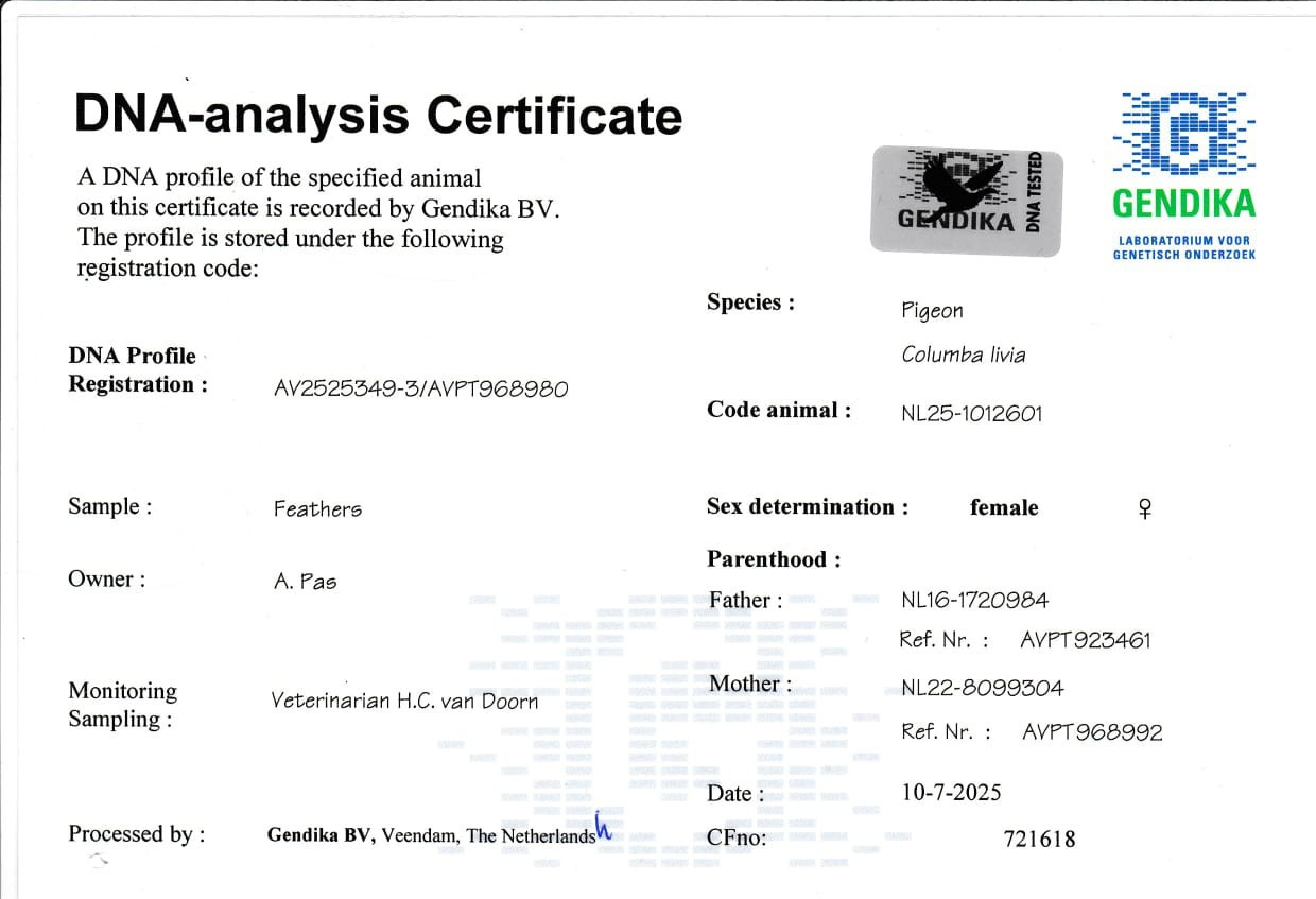 (DNA CERTIFIED – a DNA Certificate comes with the pigeon)