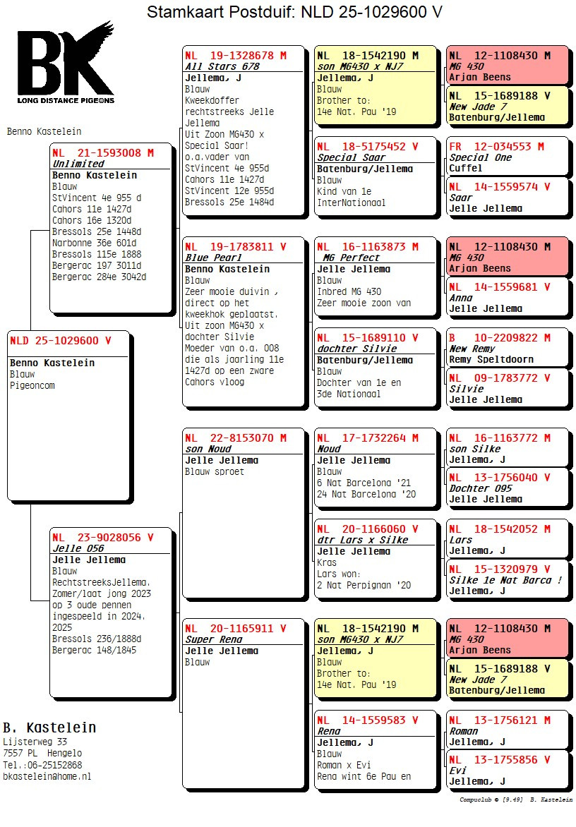 Daughter of super flyer “UNLIMITED” 4 St Vincent 955, 11 Cahors 1.427, 16 Cahors 1.320, 25 Bressols 1.448, 36 Narbonne 601, 115 Bressols 1.888, 197 Bergerac 3.011, 284 Bergerac 3.042 pigeons x granddaughter “NOUD” 6th National Barcelona ’21, 24th National Barcelona ’20 & “RENA” !!