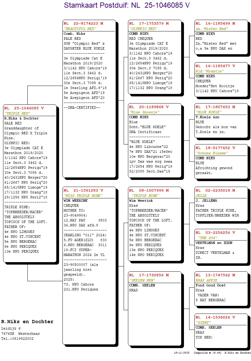 Mother : “MISS TRIPPLE NINE” mother of “MISS PAU” 12 National Pau 3.503 ’25 and “SUPER 011” 5 FU/ZLU Agen 830, 6 NPO Bergerac 3.011, 19th FCI World’s Best Marathon Pigeon ’24 !!