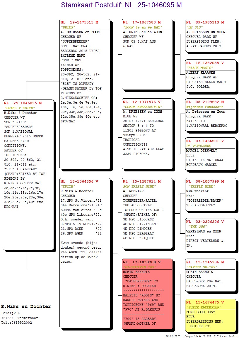 Father : “DRIES” (gr)father of 2, 3, 3, 6, 7, 9, 10, 11, 15, etc NPO, National and son of 1st National Bergerac 11.201 pigeons !!