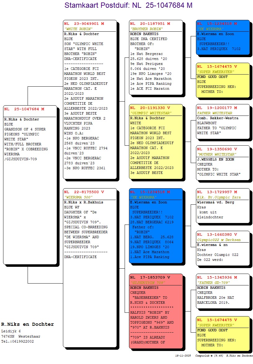 Mother : daughter of “GIJSDUIVIN-709” (gr)mother of 1, 2, 2, 3, 3, 3, 6, 7, 9, 10, 10, 11, 15, 16, etc NPO, National !! Halfsister “DE 969” 3 NPO Bergerac, 6 NPO Libourne, 8 NPO Bergerac, “DE 970” 1st National Cahors, “ROBIN” 1st National Bergerac, 1st FCI World’s Best Ace Marathon Pigeon ’21 x “DE WIERSMA ” father of “DE 969” 3 NPO Bergerac, 6 NPO Libourne, 8 NPO Bergerac, “DE 970” 1st National Cahors, “ROBIN” 1st National Bergerac, 1st FCI World’s Best Ace Marathon Pigeon ’21 !!