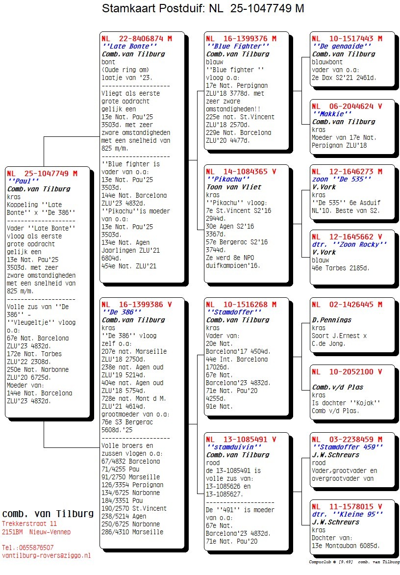 “LATE BONTE” is a son of the super pair “BLUE FIGHTER” 17 National Perpignan, 229 National Barcelona, etc x “PIKACHU” 8th National Ace Marathon NPO, 7 National s2 St Vincent, 30 National s2 Agen, 57 National s2 Bergerac