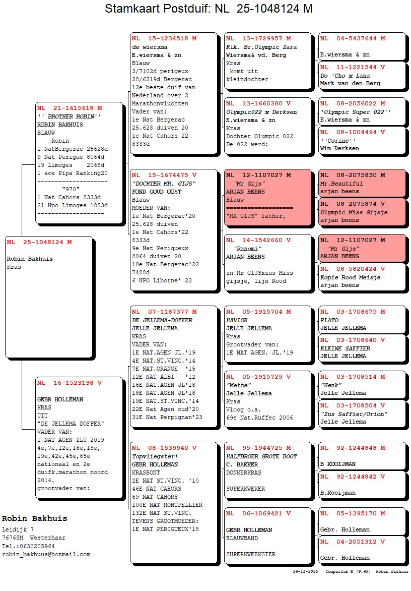 Mother : daughter of super breeder “DE JELLEMA DOFFER” father of a.o. 1st National Agen ZLU, 4 National St Vincent, 7 National Orange, 12 National Albi, 16 National Agen ZLU, 18 National Agen ZLU, 31 National Perpignan, etc