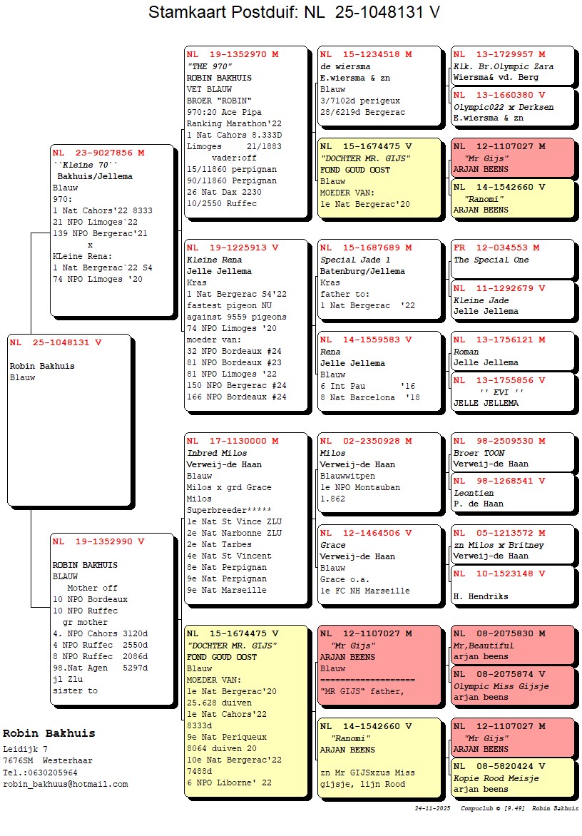 Mother : daughter of “Daughter MR. GIJS” – mother of “ROBIN” 1st National Bergerac 25.628 pigeons, 9 National Perigueux 8.064 pigeons, 1st FCI World’s Best Ace Marathon Pigeon ’21, “DE 970” 1st National Cahors 8.333 pigeons and “DE 969” 7 National Ace Marathon FCI ranking, 8 National Ace Marathon PiPa ranking, 3 NPO Bergerac, 6 NPO Libourne, 8 NPO Bergerac