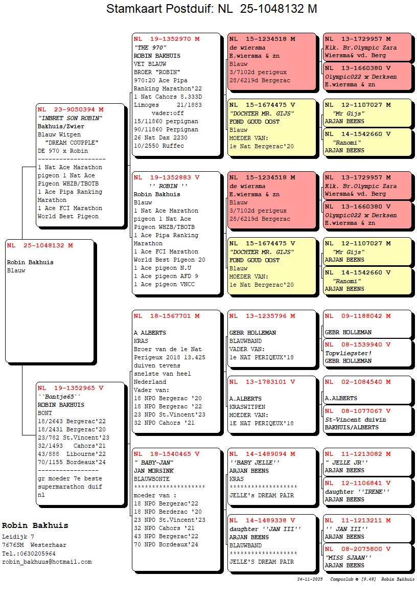 Father : son SUPER COUPLE “DE 970” 1st National Cahors 8.333 pigeons x “ROBIN” 1st National Bergerac 25.628 pigeons ’20, 9 National Perigueux 8.064 pigeons, 1st FCI World’s Best Marathon Pigeon ’21 !!