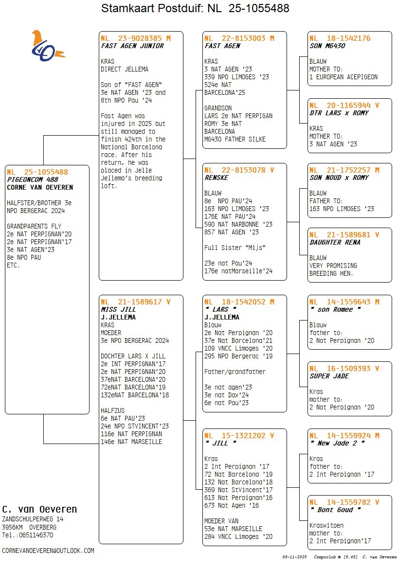 Father = son “FAST AGEN” 3 National Agen ZLU ’23 x “RENSKE” full sister “MIJS” 23 National Pau ’24, 176 National Marseille ’24 – direct Jelle Jellema
