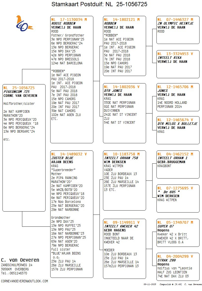 Father = “ROOIE ROBBEN” – son of “ROBBEN” 1st National & 1st International Ace Pau 2 yrs – direct Verweij de Haan