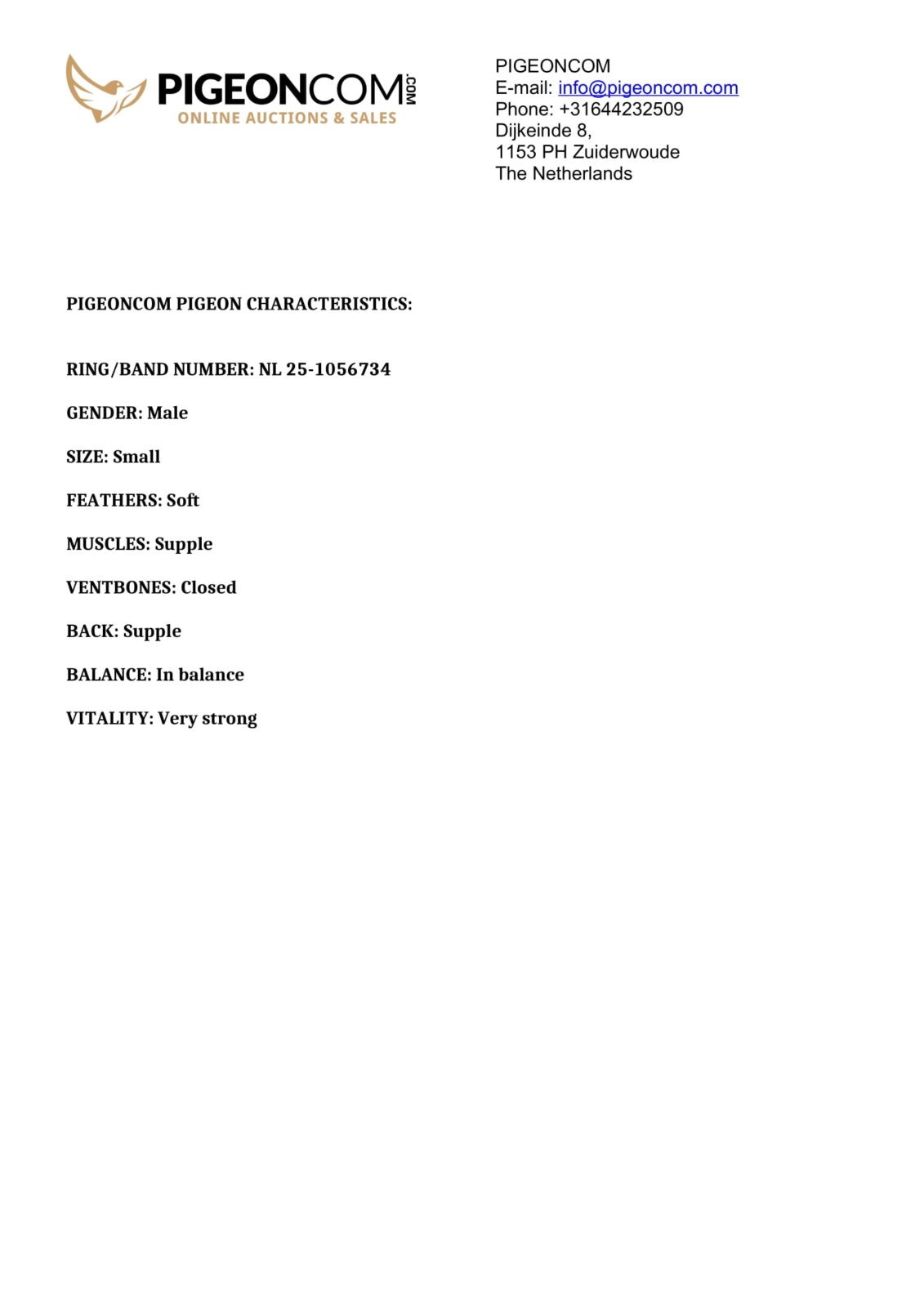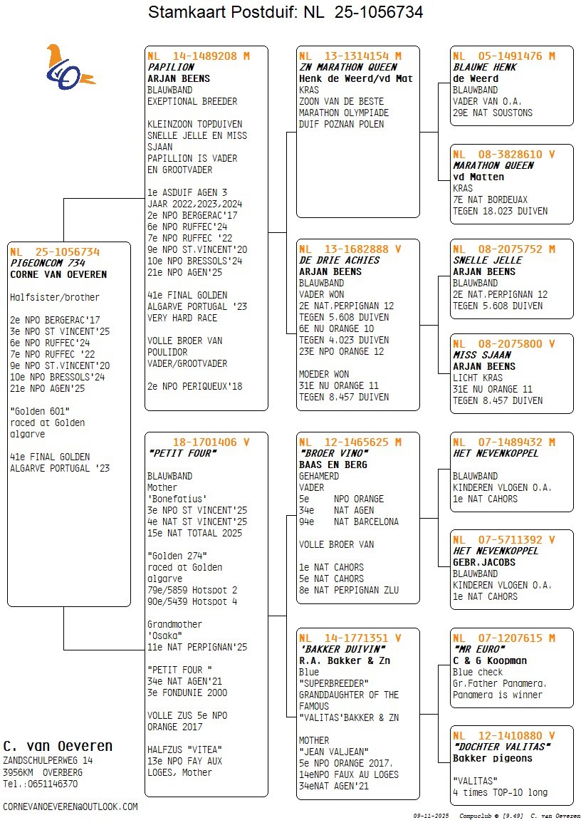 Father = superbreeder “PAPILION” 1st Ace Agen ZLU 3 yrs 2022-2024, 2 NPO Bergerac, 6 NPO Ruffec, 7 NPO Ruffec, 9 NPO St Vincent, 10 NPO Bressols, 21 NPO Agen, 41 Final Golden Algarve Portugal ’23 (very hard race!), etc
