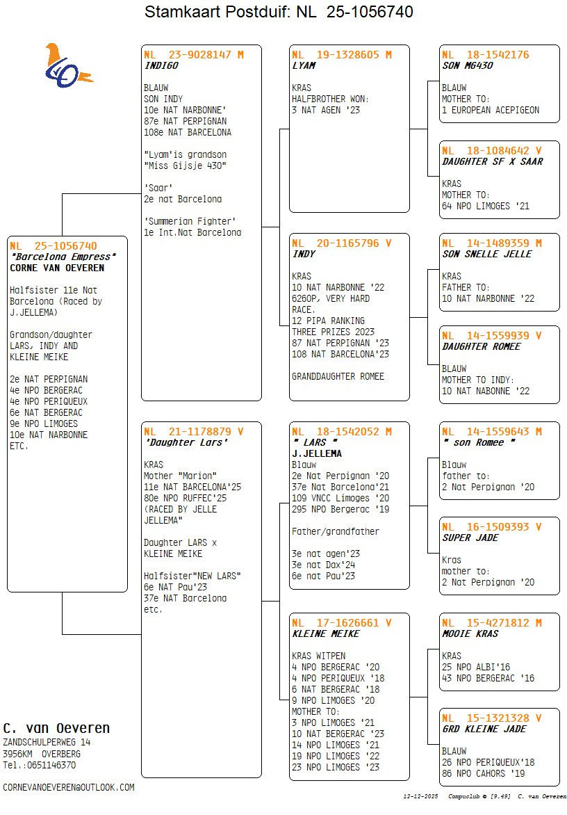 A halfsister of “MARION” 11th National Barcelona (17th International Barcelona 15.602 pigeons) ’25 !! 100% Jelle Jellema !