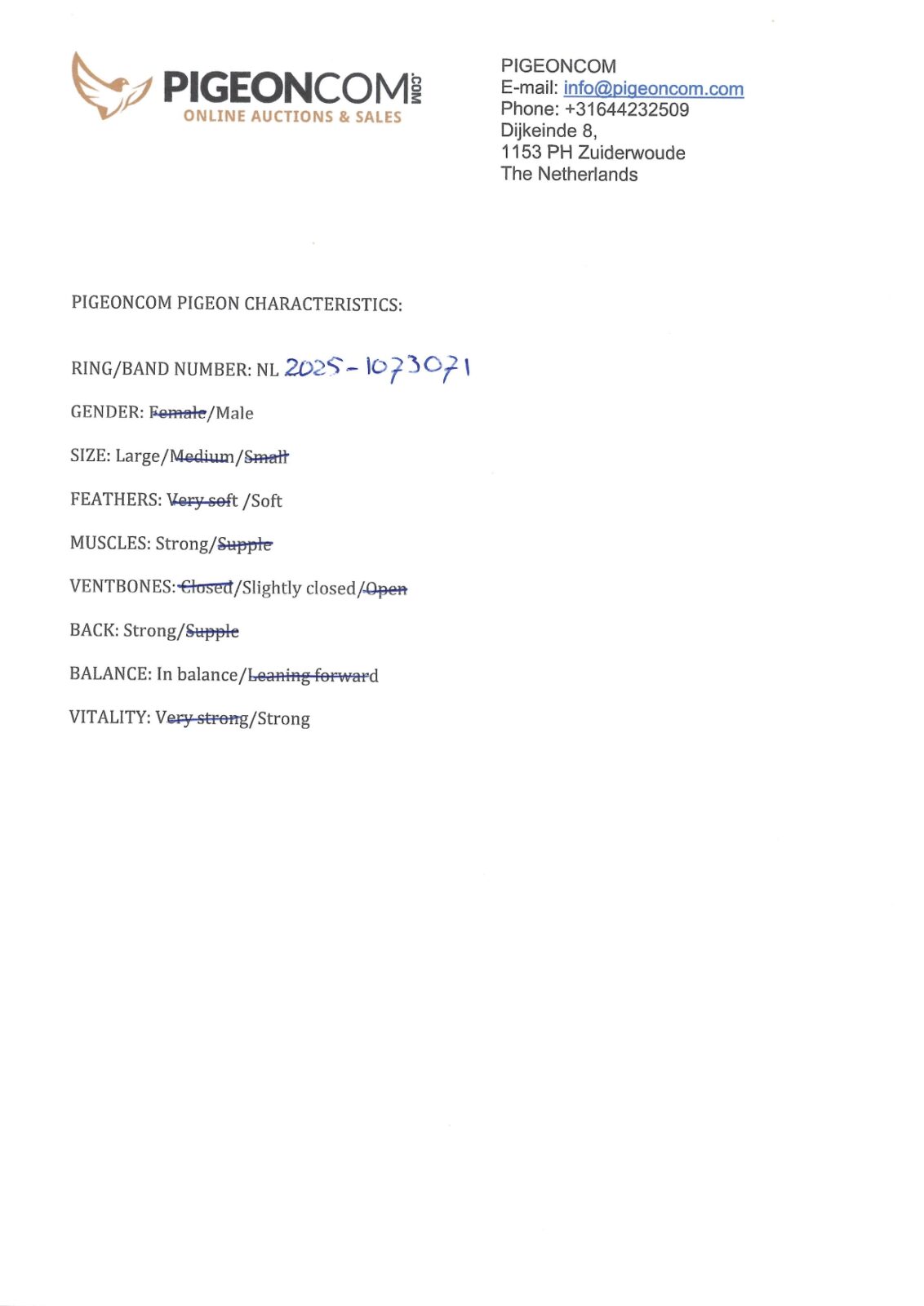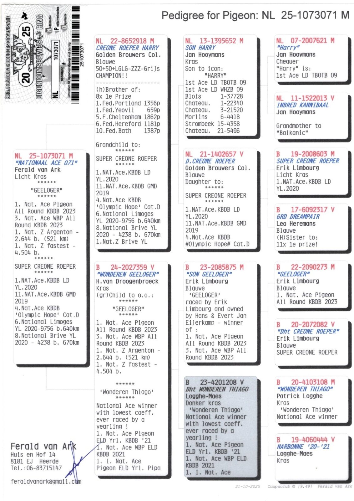 Grandson “CREONE ROEPER” 1st National Ace Long distance KBDB ’20 and “HARRY” 1st National Ace Long distance TBOTB & WHZB x granddaughter “GEELOGER” 1st National Ace Allround KBDB ’23 & “WONDEREN THIAGO” 1st National Ace Extreme long distance Yearlings KBDB ’21 with lowest coefficient ever !