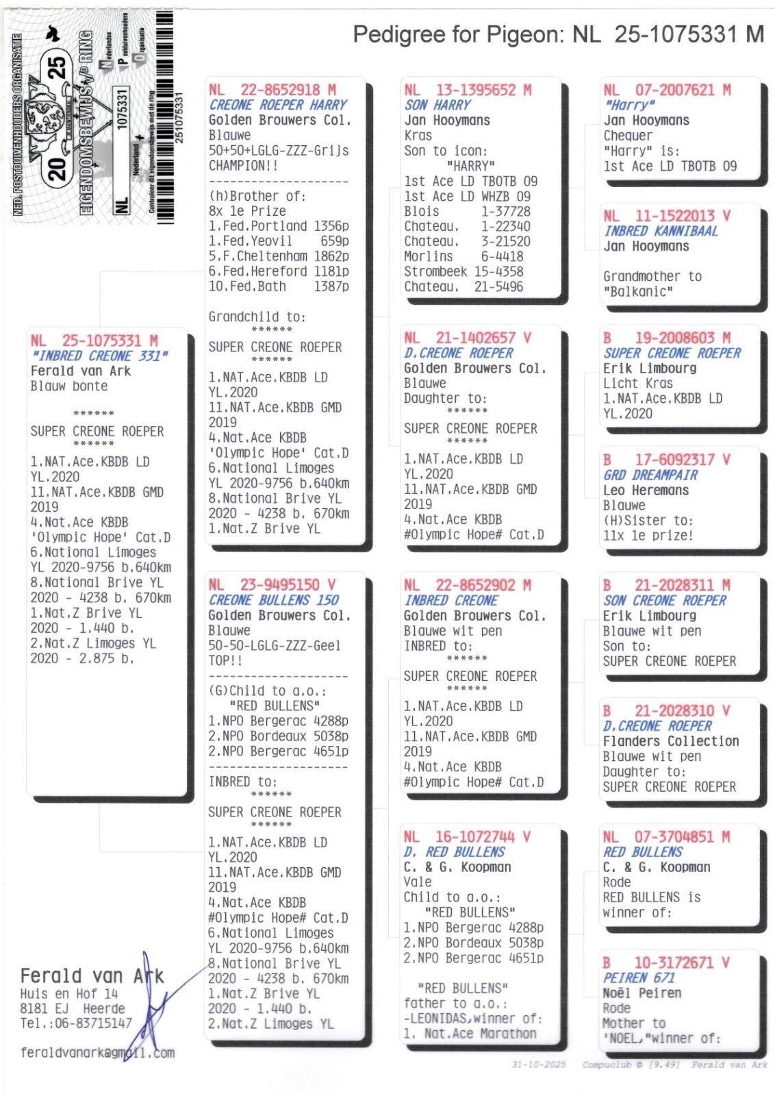 Mother = inbreed “CREONE ROEPER” 1st National Ace Long distance KBDB ’20 and granddaughter of “RED BULLENS” 1 NPO Bergerac 4.288, 2NPO Bordeaux 5.038, 2 NPO Bergerac 4.651