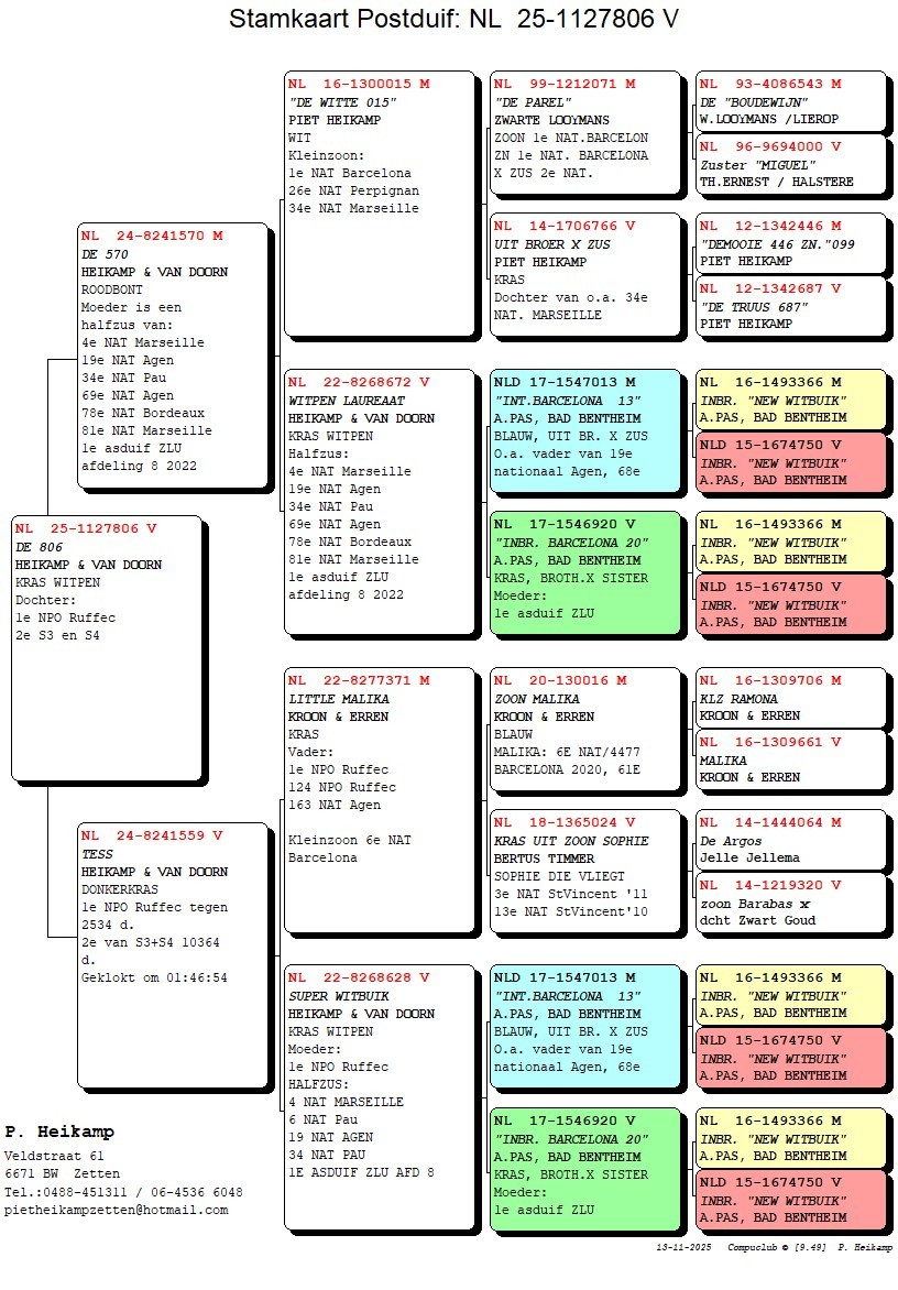 Daughter of “TESS” 1st NPO Ruffec 2.534 pigeons, 2nd National Ruffec 10.364 pigeons s3+s4 – nightflyer clocked at 01.46.54 am !! “NEW TESS” is inbreed (grandson x granddaughter) of the super breeders “BARCELONA 13” x “BARCELONA 20” !