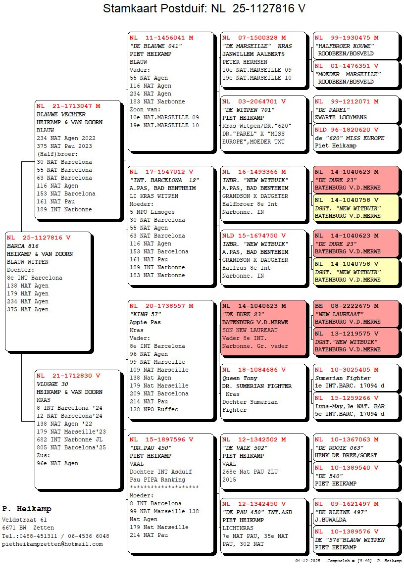 Sire: Halfbrother of 30, 55, 63, 153 National Barcelona and a son of super breeder “INT. BARCA 12” (line “NEW WITBUIK“1st National Barcelona x “NEW LAUREAAT” 1st International Barcelona) mother of 30, 55, 63, 153 National Barcelona !!