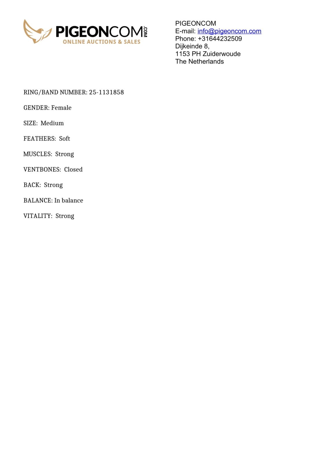 Mother = daughter of “SPECIAL MARNOUK” 25 National Perpignan (1st Dutch.National yearling)– direct Batenburg van de Merwe