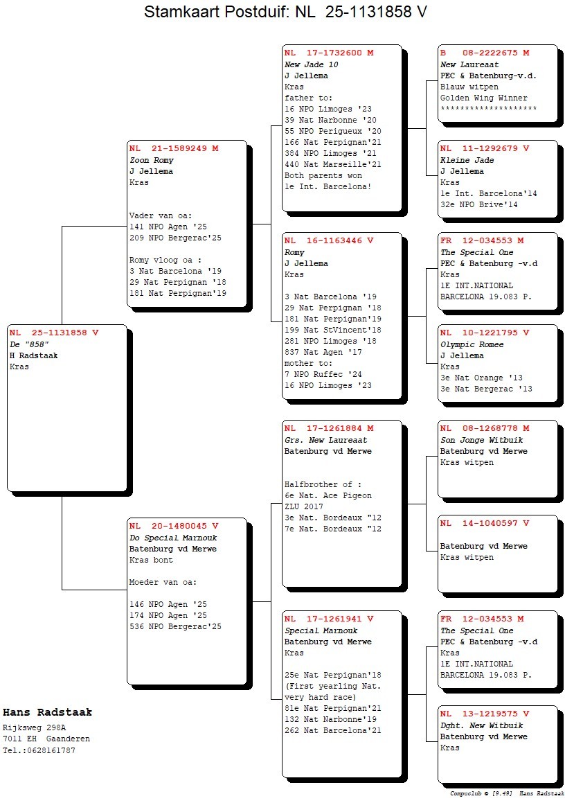 Mother = daughter of “SPECIAL MARNOUK” 25 National Perpignan (1st Dutch.National yearling)– direct Batenburg van de Merwe