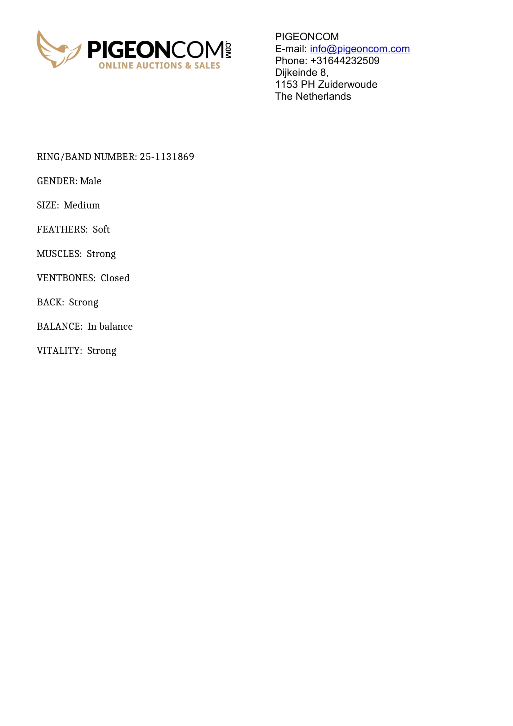 Mother = mother of the 42nd National Bergerac 21.025 in ’25 and inbreed to “MG430” the famous superbreeder of Jelle Jellema