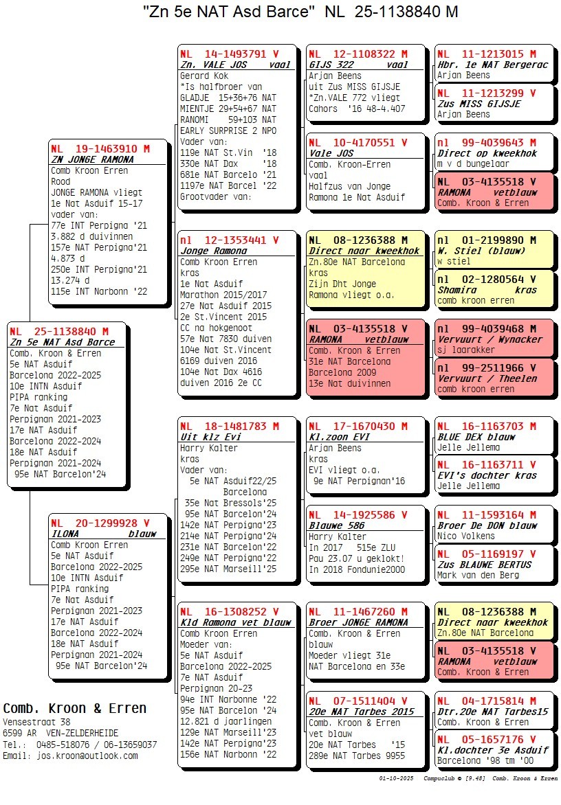JONGE RAMONA de 1e Nationale Asduif Fond Middaglossing over de jaren 2015 t/m 2017. Deze JONGE RAMONA was gekweekt uit hun SUPER duif RAMONA, een echte topvliegster met 12 overnachtprijzen o.a. een 31e nationaal Barcelona en een 33e nationaal Tarbes.