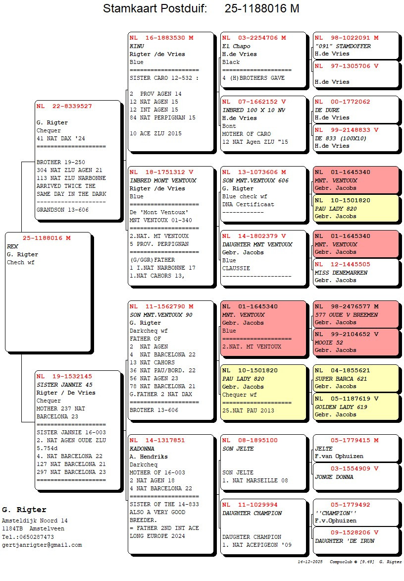 Grandson of SUPERBREEDER ” SON MONT VENTOUX 606 ” x sister “JANNIE” 2 National Agen ZLU, 4 National Barcelona, 127 National Barcelona , 297 National Barcelona !!