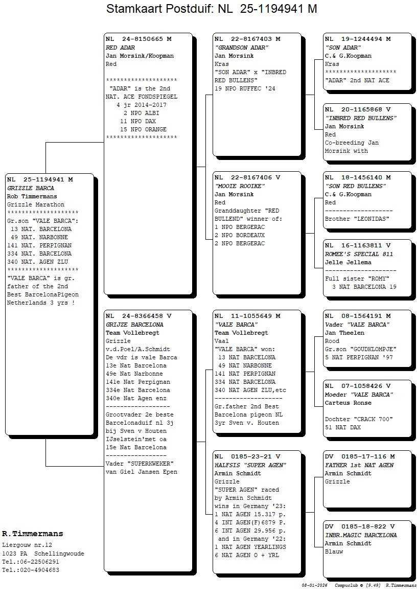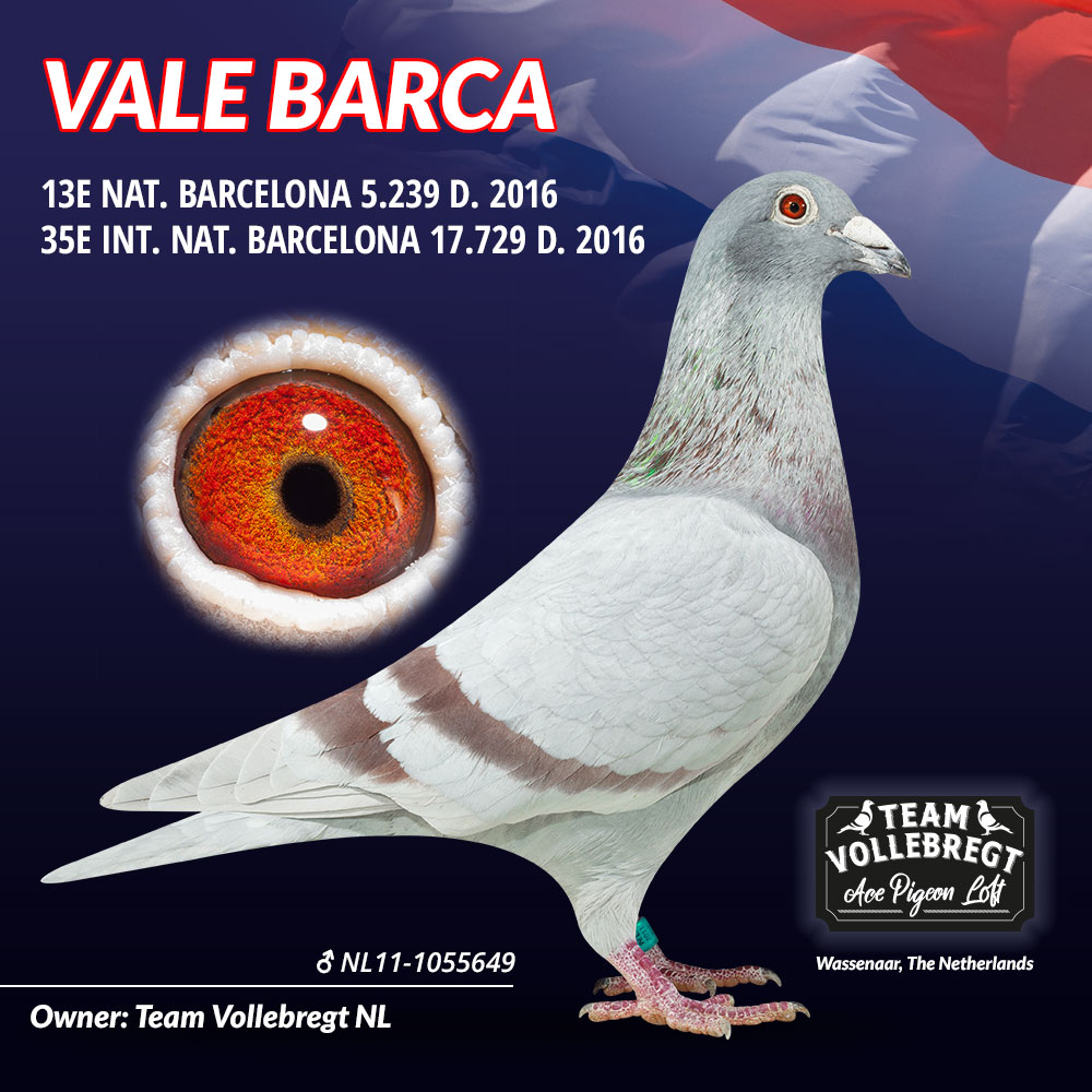 Dam: Daughter “VALE BARCA” 13th National Barcelona and grandfather of the 2nd National Ace Barcelona 3 yr (Wim & Sven van Houten) x halfsister of the 1st National Agen 15.317 pigeons (Armin Schmidt)