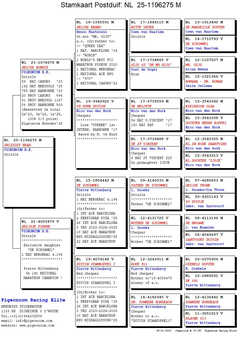 Dam: “GRIJSJE PIERRE” daughter of the base breeding couple of Pierre Wittenberg “DE SCHIMMEL” (1st National Bergerac 4.194) x “STAMDUIVIN I”, grandparents of the 1st International Ace Barcelona & Perpignan ’25, 26th International Ace Barcelona 3 yr 2023-2025, 18th National Ace NPO Marathon, 22nd National Ace NPO Marathon !!