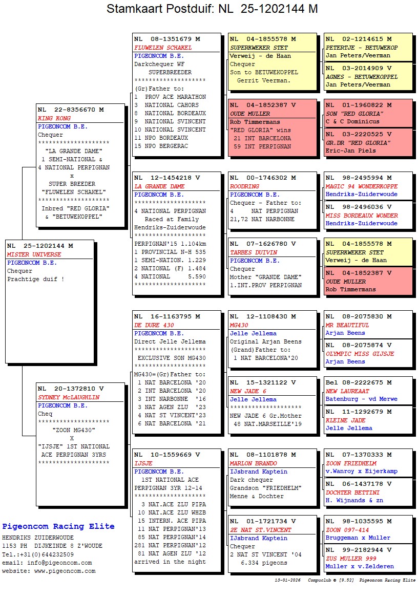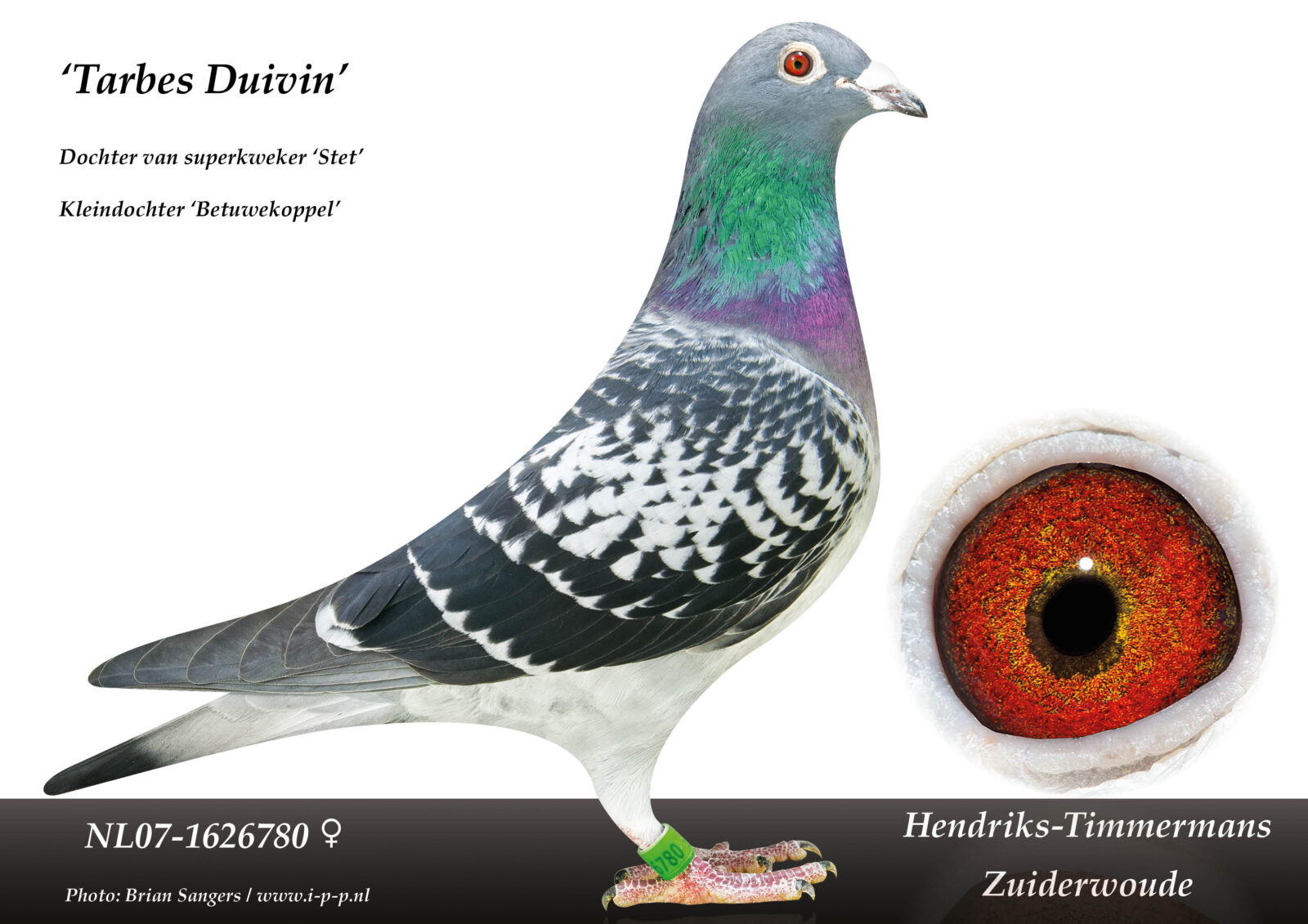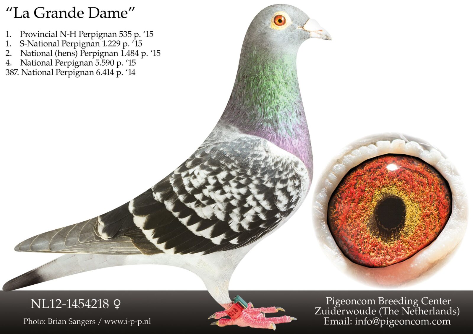 Sire: Son of topbreeder “FLUWELEN SCHAKEL” (son “SUPERKWEKER STET”) x “LA GRANDE DAME” 1st Semi National Perpignan 1.229, 4th National Perpignan 5.590, and granddaughter “SUPERKWEKER STET” & “WONDERKOPPEL” more than 150 different descendants of our “WONDERKOPPEL” win in first 150 National !