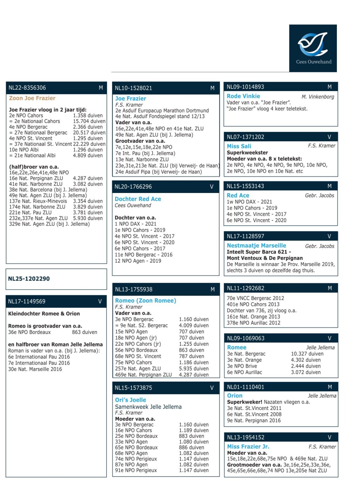 Son “JOE FRAZIER” x daughter “RED ACE” (1 NPO Dax, 1 NPO Cahors, 4 NPO St Vincent, 6 NPO St Vincent, 6 NPO Cahors, 11 NPO Bergerac, 12 NPO Agen) paired to son a of “ROMEO” (father of the 3rd NPO Bergerac 1.160 pigeons and a son of “ROMEE” Jelle Jellema) x daughter “ORION” !
