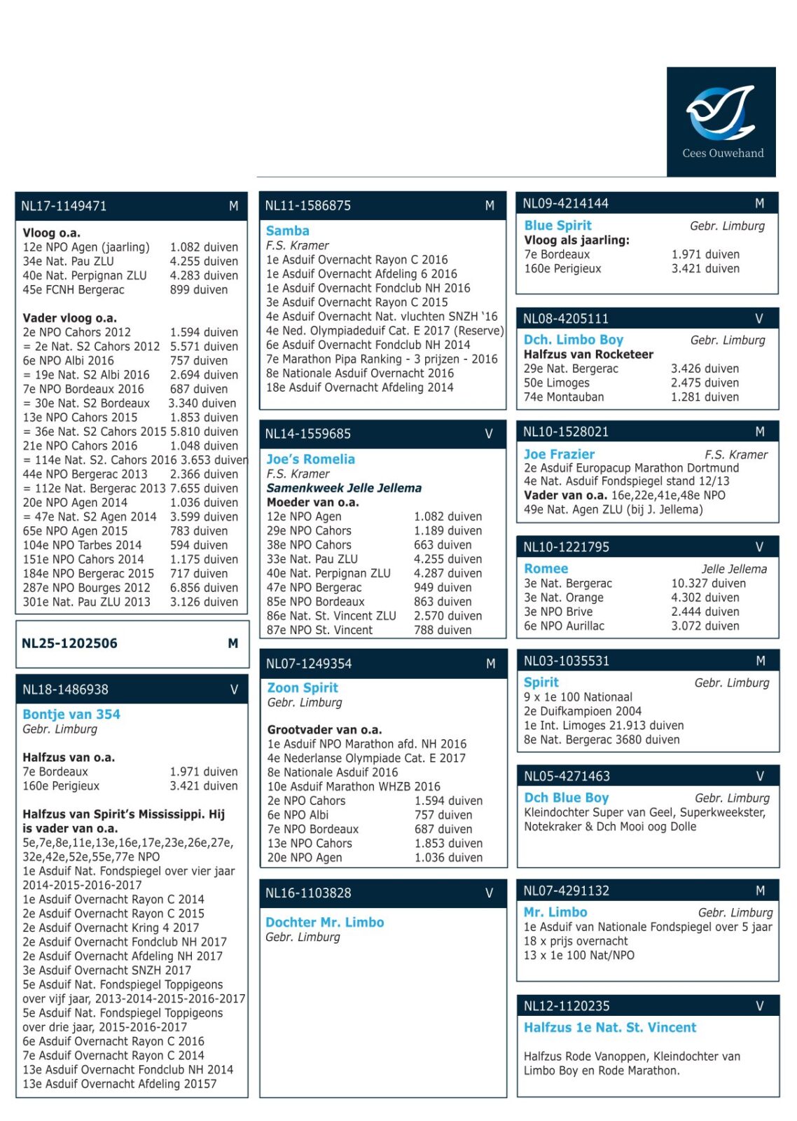 Son “SAMBA” 1st Provincial Ace Marathon NPO, 4th Olympic Ace Marathon NL (1st reserve) x granddaughter (direct Gebr. Limburg) “SPIRIT” (9x in the 1st 100 National) and “MR. LIMBO” 1st National Ace Marathon “De Fondspiegel” (13x in the 1st 100 National/NPO)!!