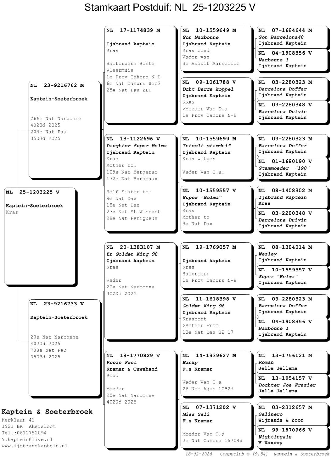 Daughter “DE 733” 20 National Narbonne 4.020 pigeons ’25 ! Inbred to “SUPER HELMA” one of the basic pigeons of Kaptein Soeterbroek, mother 9 National Dax, 18 National Dax, 23 National St Vincent, 28 National Perigueux, etc and inbred to basic breedingcouple “BARCELONA DOFFER” x “BARCELONA DUIVIN” !!