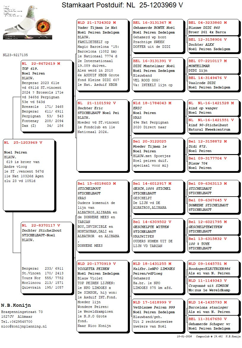 Daughter of “TOP 619” halfbrother of “TIJMEN” 1st National Bressols 18.140 pigeons ’25 and full brother of “ANDRE” 1st Provincial St Vincent, 11th National St Vincent 10.326 pigeons !