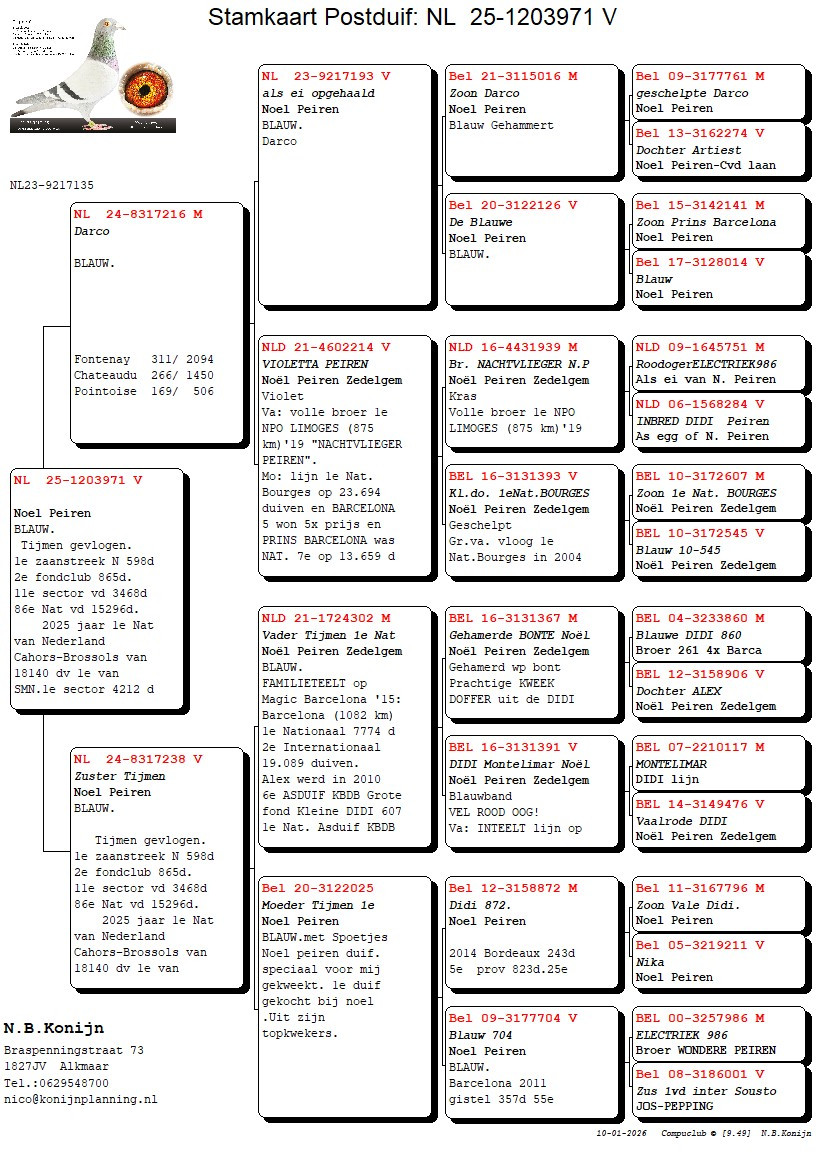 100% Noel Peiren – Very nice daughter of “SISTER TIJMEN”- “TIJMEN” winner of the 1st National Bressols 18.140 pigeons ’25 !!