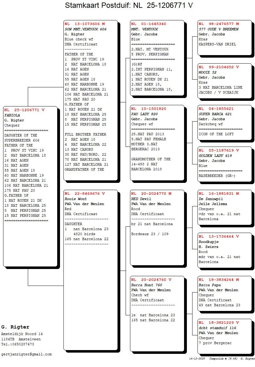 Dam: “ROOIE WOUT” – DNA certified daughter of “BARCA BONT 760” 1st National Barcelona 4.820 pigeons ’23 (direct PWA van der Meulen) !!