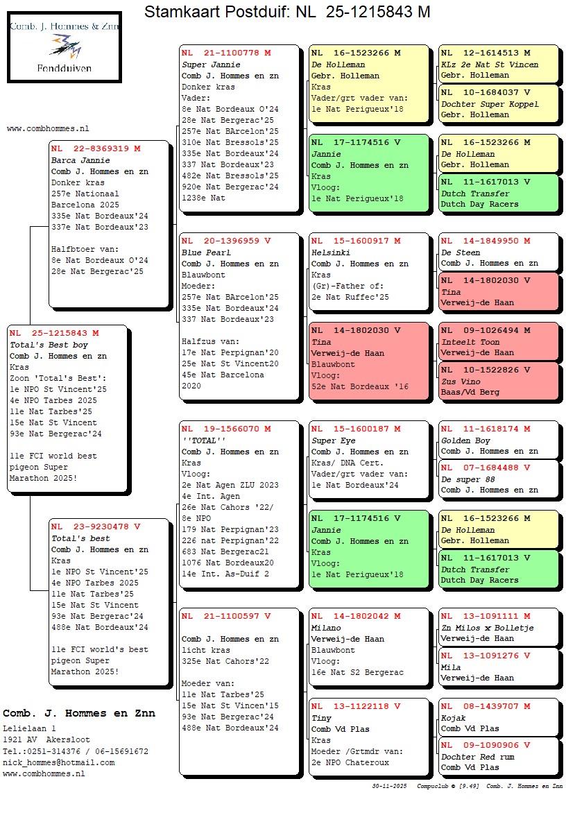 Son “TOTAL’S BEST” 11th World’s Best Super Marathon Pigeon Netherlands FCI 2025, 1 NPO St Vincent ’25, 4 NPO Tarbes ’25, 11 National Tarbes, 14 National St Vincent x “BARCA JANNIE” 257 National Barcelona ’25 !