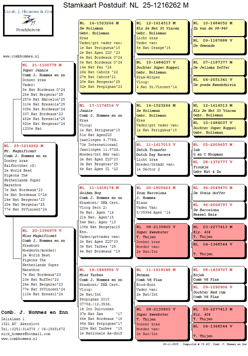 Son “SUPER JANNIE” (son “JANNIE” 1st National Perigueux) x “MISS MAGNIFICENT” mother of “LINDA” 2nd World’s Best Super Marathon Pigeon FCI Netherlands !!