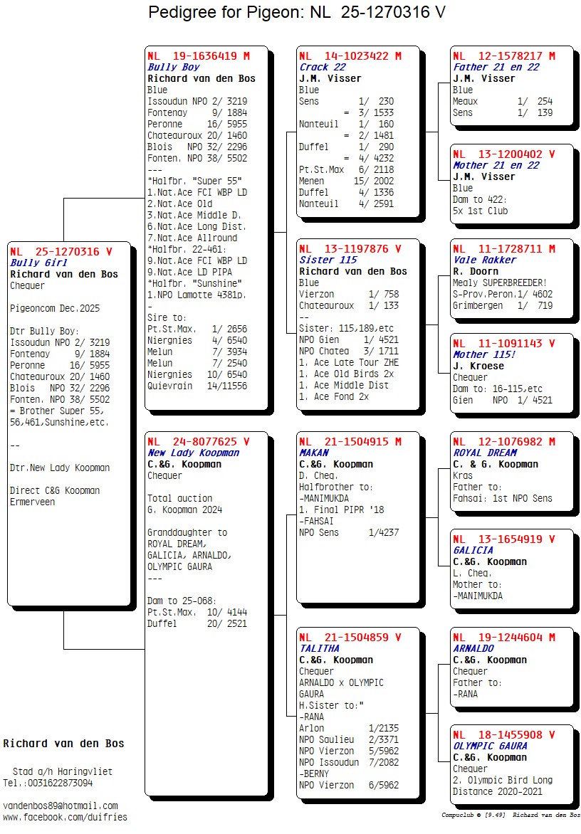 Daughter “BULLY BOY” 2 NPO Issoudun 3.219 pigeons & halfbrother “SUPER 55” 1st FCI World’s Best Pigeon Long Distance !!