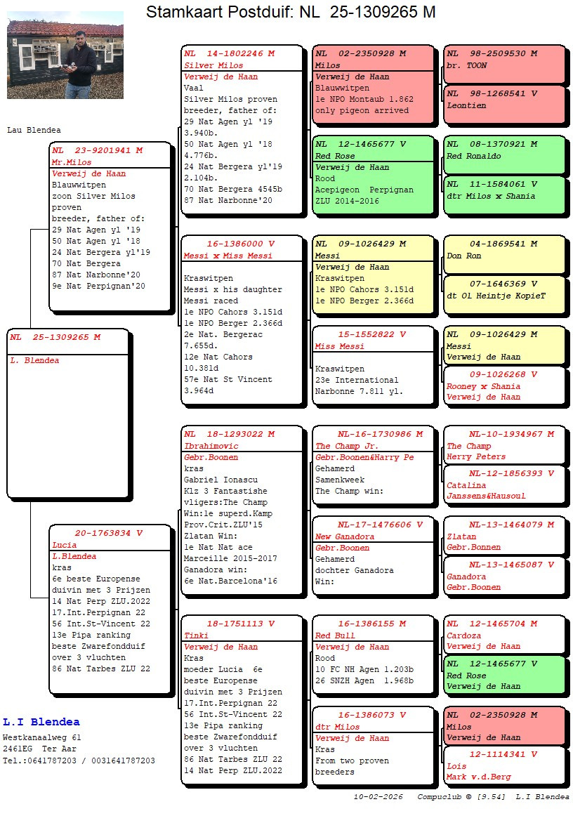 Son of topbreeder “SILVER MILOS” (son “MILOS” x “RED ROSE“) x “LUCIA” 6th Best European Extreme Marathon Pigeon (H) PiPa ranking & 13th Best European Marathon Pigeon overall !