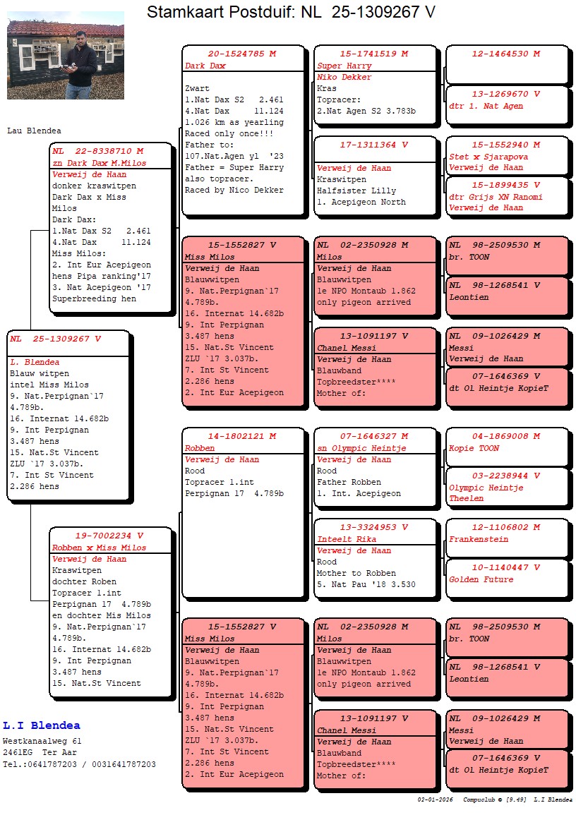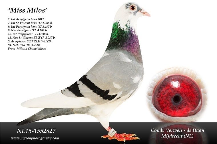 Daughter “ROBBEN” x “MISS MILOS” x son “DARK DAX” 1st National s2 Dax, 4th National Dax overall 11.124 pigeons (son “SUPER HARRY” Harry Hendriks !!) x “MISS MILOS” 2nd International Ace (F) Extreme Marathon Pipa ’17 !!
